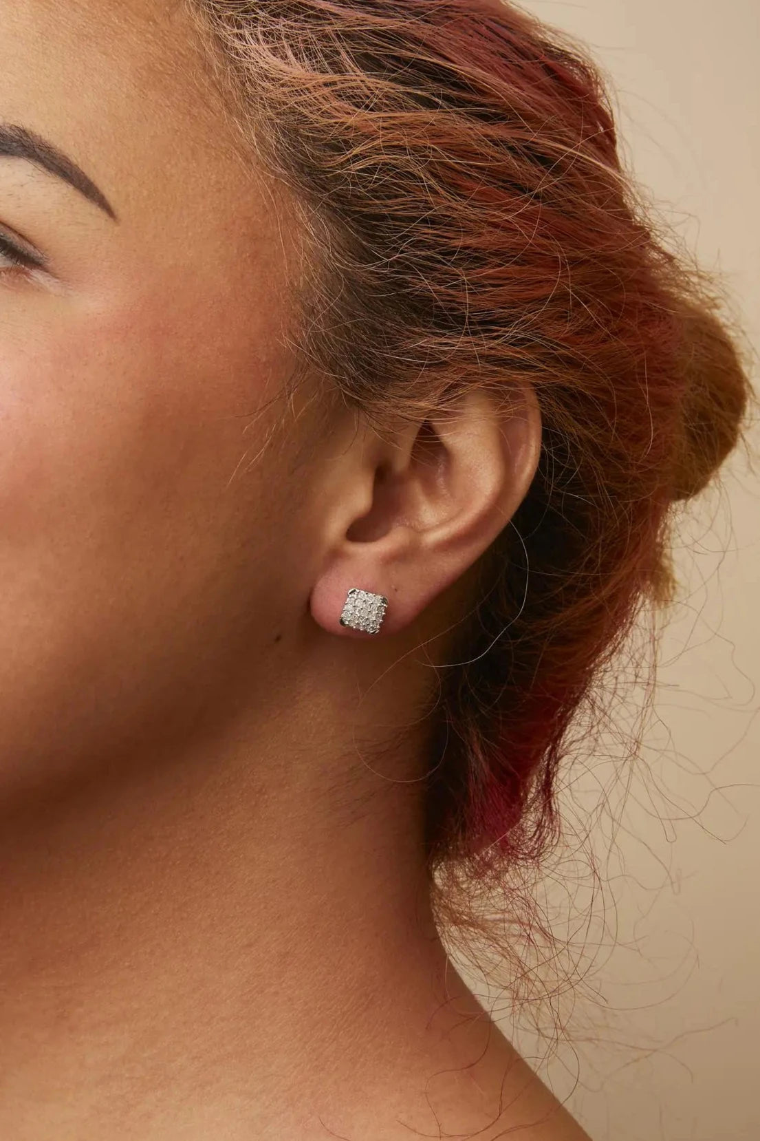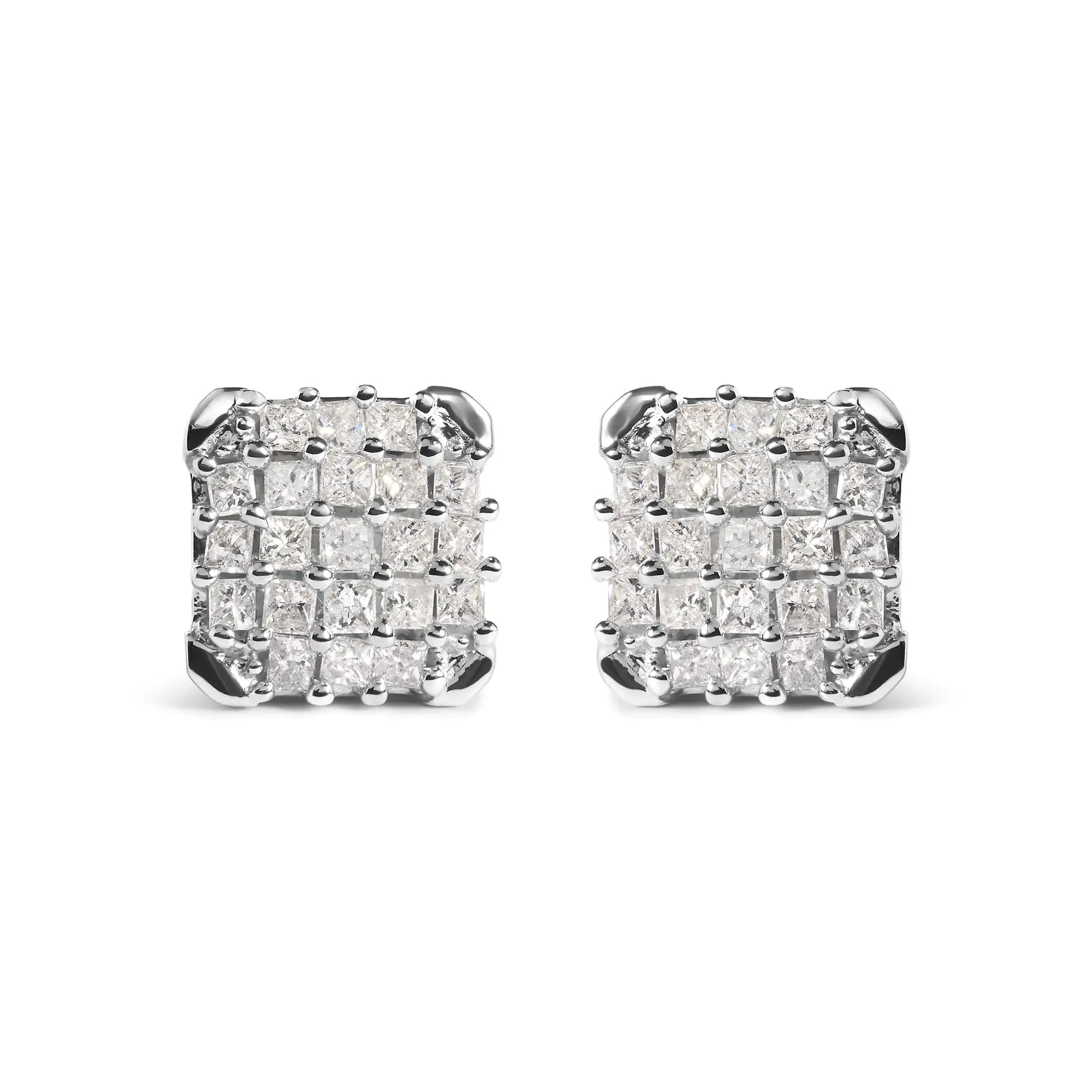 Indulge in the exquisite beauty of these 10K white gold diamond composite stud earrings. Adorned with 42 natural princess diamonds, these earrings boast a total weight of 3/4 cttw. The open frame design adds a touch of elegance, while the prong setting ensures the diamonds shine brilliantly. Featuring push back earring findings, these earrings are perfect for everyday wear or special occasions. With a color grade of I-J and clarity grade of I1-I2, these earrings are sure to make a statement. Treat yourself or someone special to the luxury of these stunning diamond earrings.